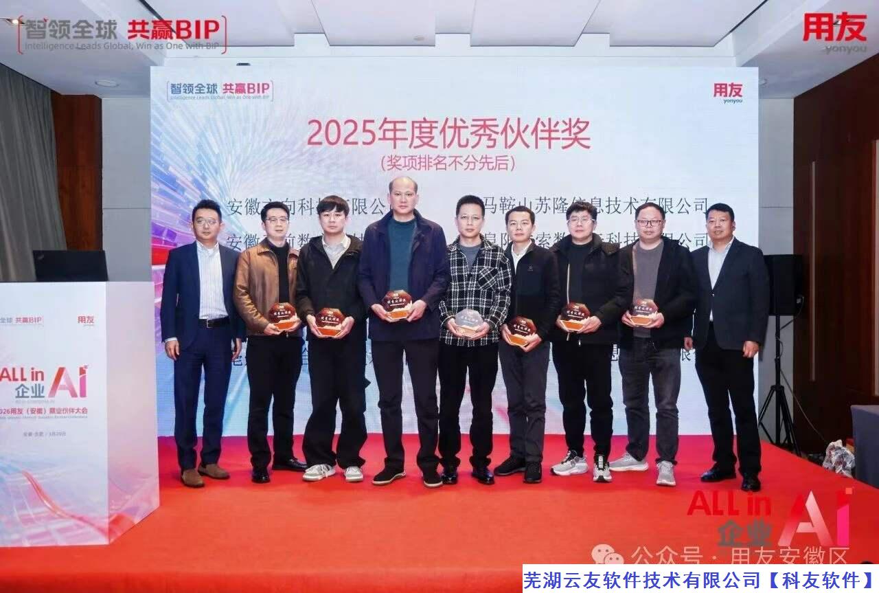 从数据孤岛到智能协同,从单点突破到生态共荣,芜湖云友软件将以此次获奖为新起点,与用友及全体生态伙伴携手,深耕行业场景,挖掘 “人工智能 +” 产业价值,为安徽培育新质生产力、构建现代化产业体系注入强劲数智动能,书写 “AI + 产业” 的芜湖答卷!