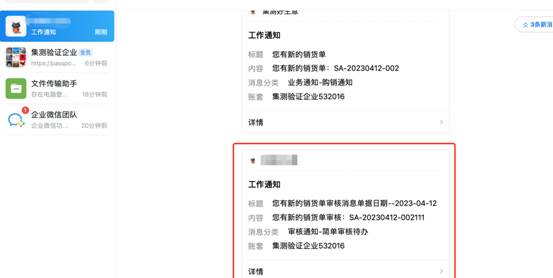 开启以后可以在手机端和电脑端企业微信中看到对应的消息记录,点击消息可跳转入对应页面