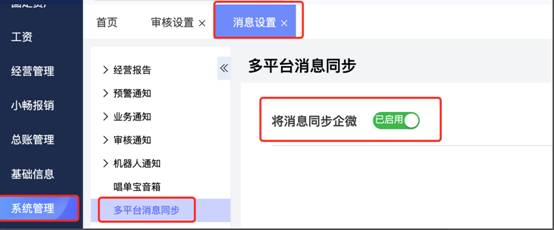 产品解决方案:进入【系统管理】-【消息设置】-【多平台消息同步】开启将消息同步企微